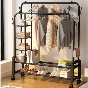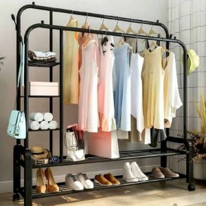 و سه قفسه در یک سمت رگالو چوب لباسی در دو طرف رگال برای کیف و کلاه و…